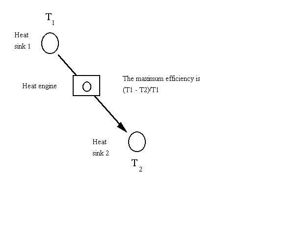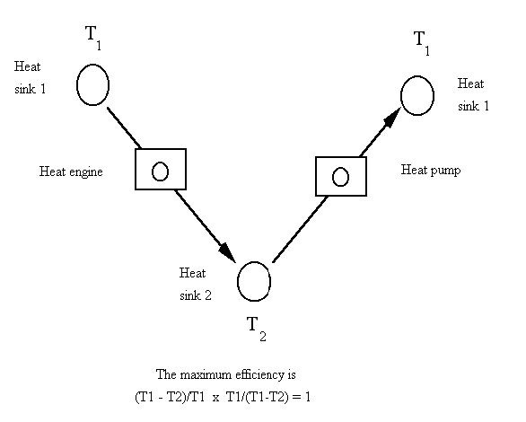 That means that all of the energy turned into work in the heat engine would power a heat pump that would put all of the energy back in the boiler, to do it again. But real-world systems have friction and heat losses, so that result of one is never attained. If we use 50% of the Carnot ideal for both the heat engine and heat pump, then the result is 0.25, which means that only 25% of the energy in the boiler would make it back to the boiler. There is more on that in coming posts.