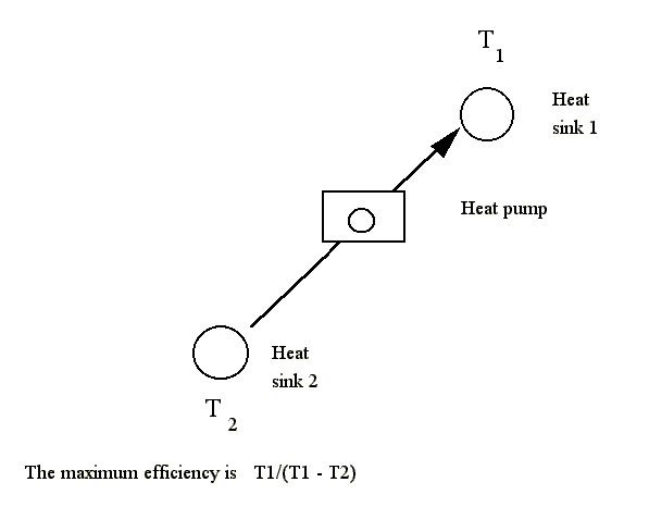 A heat engine moves heat to produce power. A heat pump is the opposite idea, of using power to move heat. The ideal heat-pump efficiency is the reverse of the heat-engine equation, which I present below.