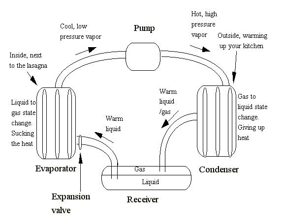 For a heat pump, and I’ll present the ideal case of an air-to-air heat pump, when the outside temperature is 40 degrees Fahrenheit and the house is being heated at 72 degrees, the maximum efficiency is called a coefficient of performance (“COP”) of 16.6. Back in the 1970s, when Dennis’s heat pump was invented, at 40 degrees, the COP was two at maximum, which is 12% (2/16.6) of the Carnot ideal. A refrigerator is a heat pump, and here is a diagram that I made many years ago on how they operate.
